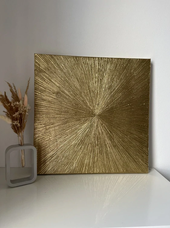 Každý reliéfní detail je vytvořen ručně ze strukturovací hmoty. Zlatá zachycuje světlo a mění se podle úhlu pohledu.