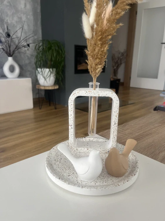 Set obsahuje: podnos s terrazzo efektem, terrazzo vázu Olívia včetně sušené květiny (viz foto, kde držím dekoraci v ruce), bílého a béžového ptáčka