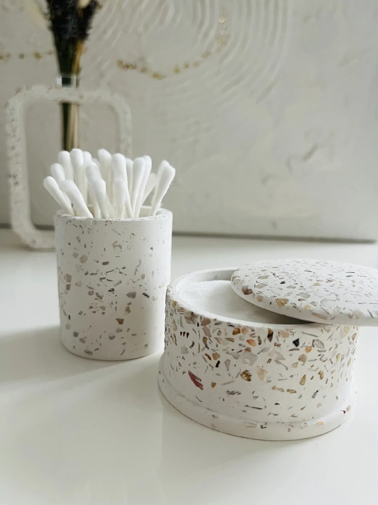 Dóza na vatové tamponky a dóza na vatové tyčinky – stylový terrazzo set do vaší koupelny
